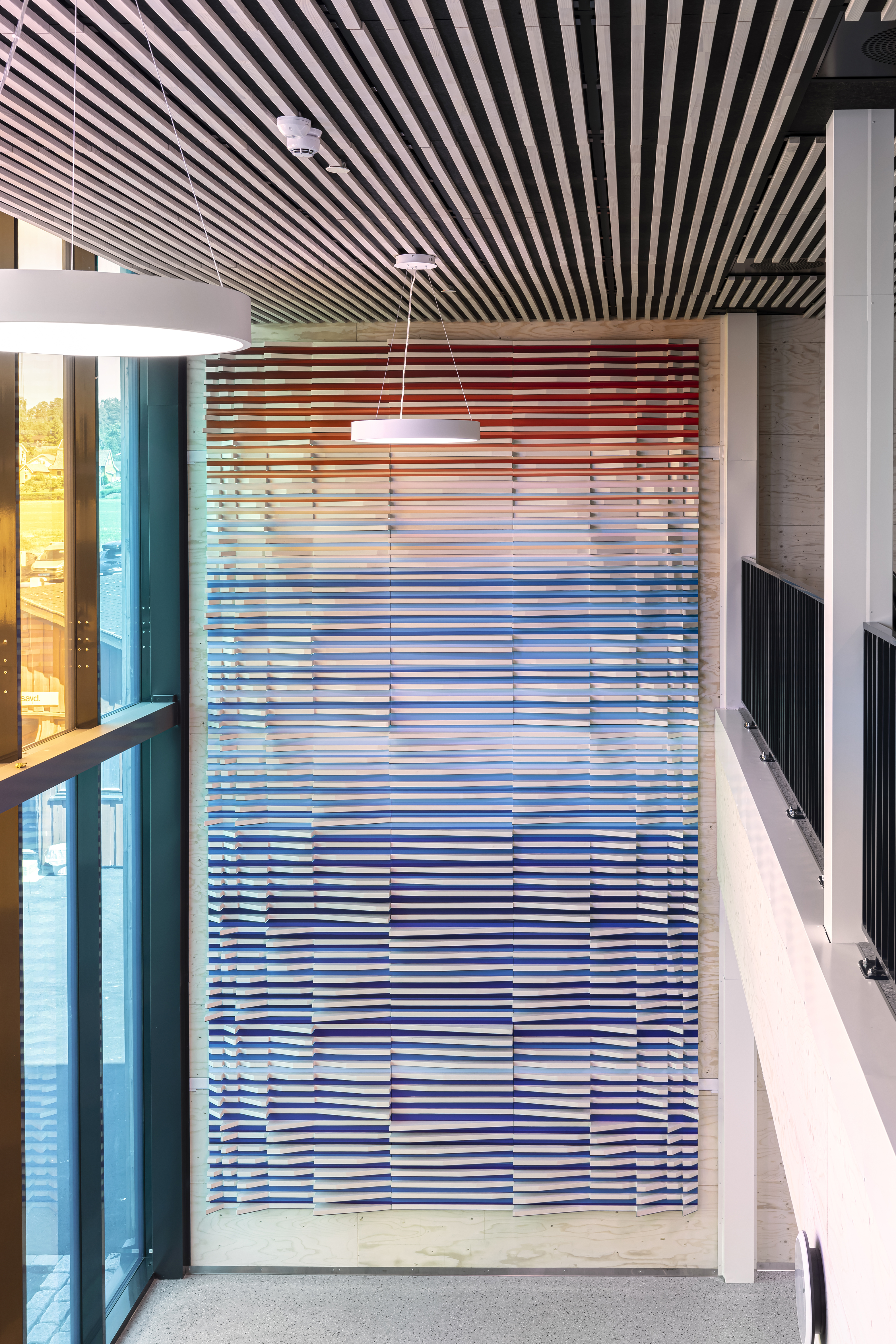 Drawing inspiration from “conglo concrete”, a technique developed in the 1960s by Norwegian architect Erling Viksjø and his artist friend Odd Tandberg in which they used natural rocks as aggregate for concrete blocks before cutting them into slabs, “Tipping Point“ celebrates their influential work and purposes a contemporary approach to concrete by using discarded materials as raw material for the artwork. The composition is built after the Fibonacci numerical sequence and explores a diamond shape to celebrate the rich archeological history of the city as a direct reference to the Municipality coat of arms. Its colour palette presents a horizontal diagrammatic combination of blues and reds that show how fast the earth is warming according to research conducted by Professor Ed Hawkins from the University of Reading (UK). The title of the artwork “Tipping Point“ refers itself to points of no return in the climate change to call all parts of society to be involved in the process of tackling the climate crisis, including sport and sport institutions as man-made global warming continues to increase.
